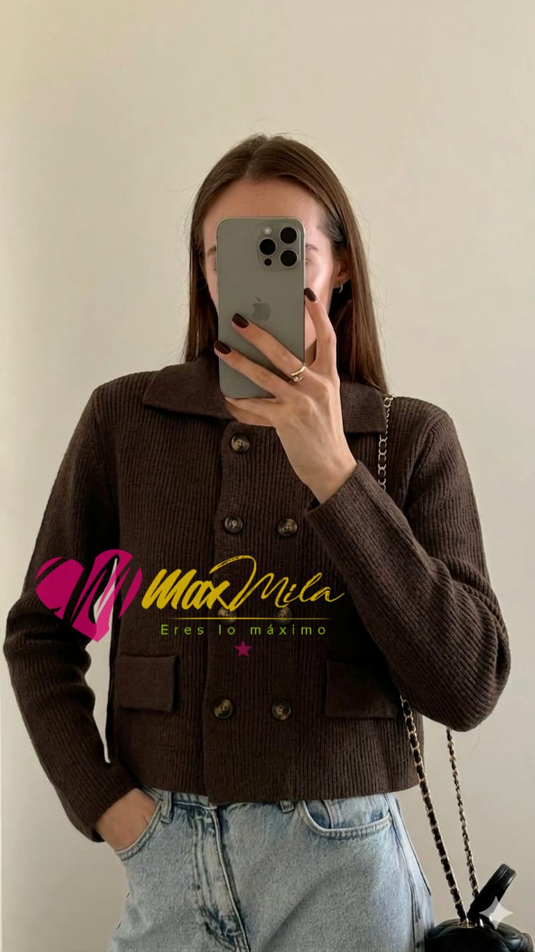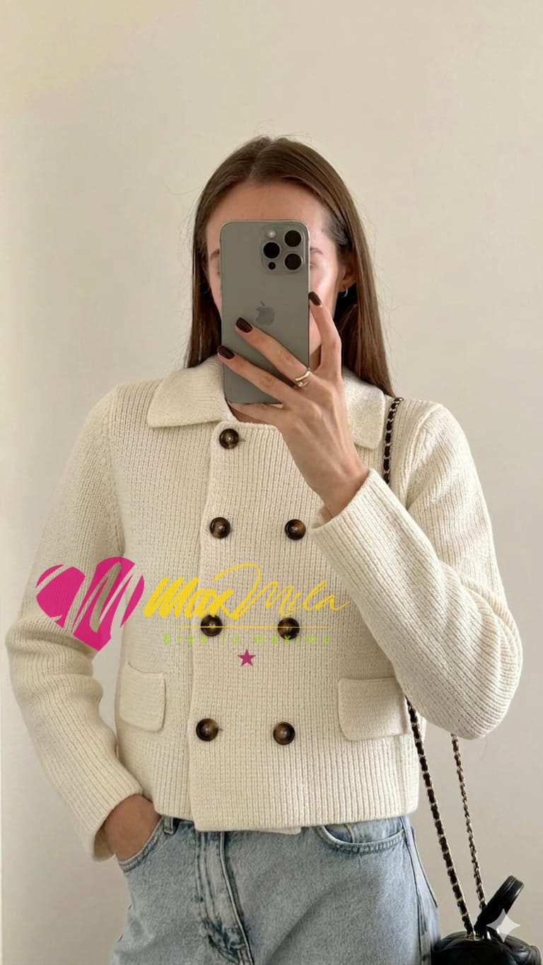 Chaqueta de tejido grueso tipo tweed, de estructura firme y textura elegante. Diseño cruzado con botones frontales y corte que estiliza la figura.