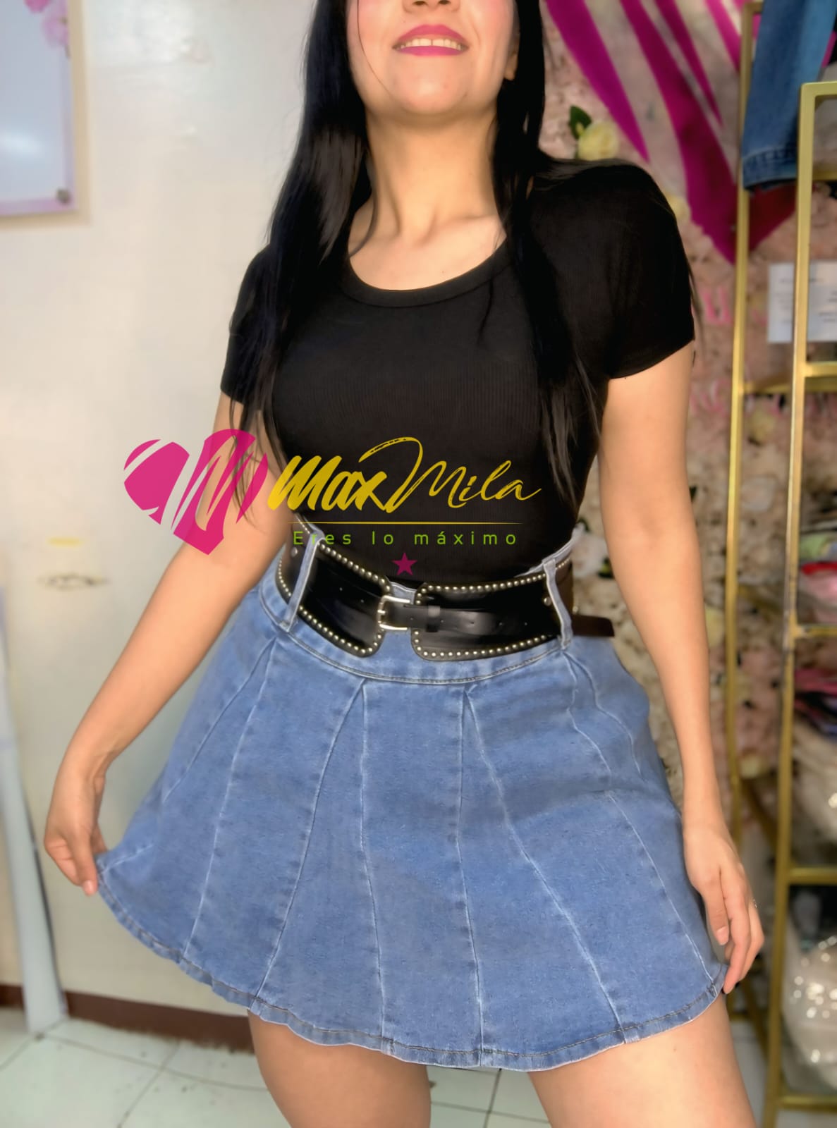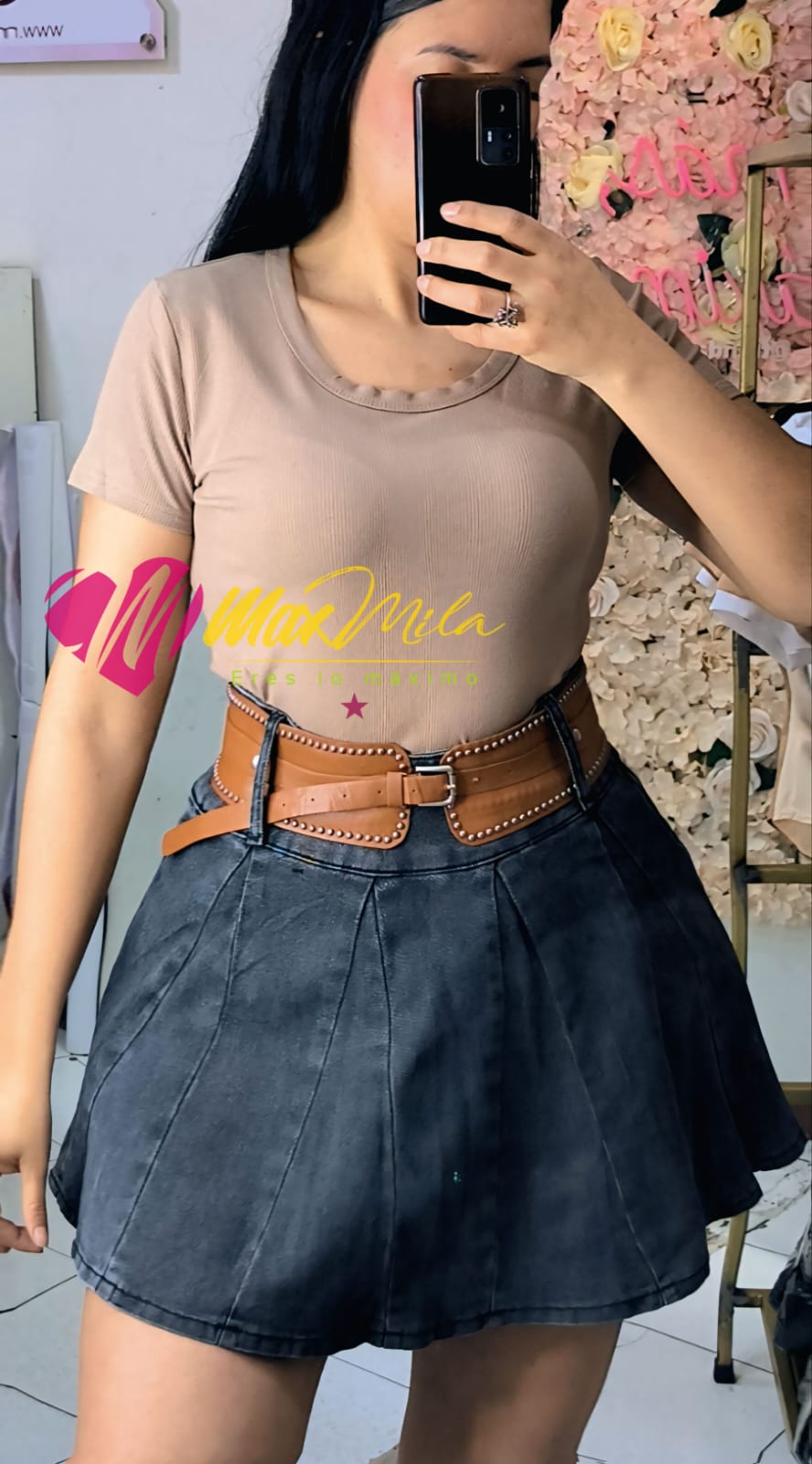 La minifalda denim que lo tiene todo. Diseño acampañado con pliegues marcados que dan volumen y un movimiento increíble. Incluye un short interior e invisible para una seguridad total, más cinturón ancho para un look 100% trendy que además estiliza la figura.