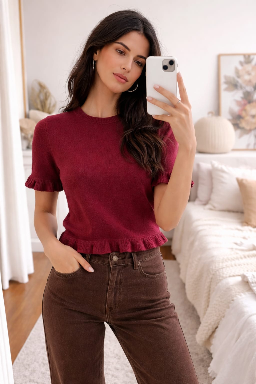Destaca por sus delicadas mangas con volantes, aportando un toque femenino y sofisticado a cualquier look